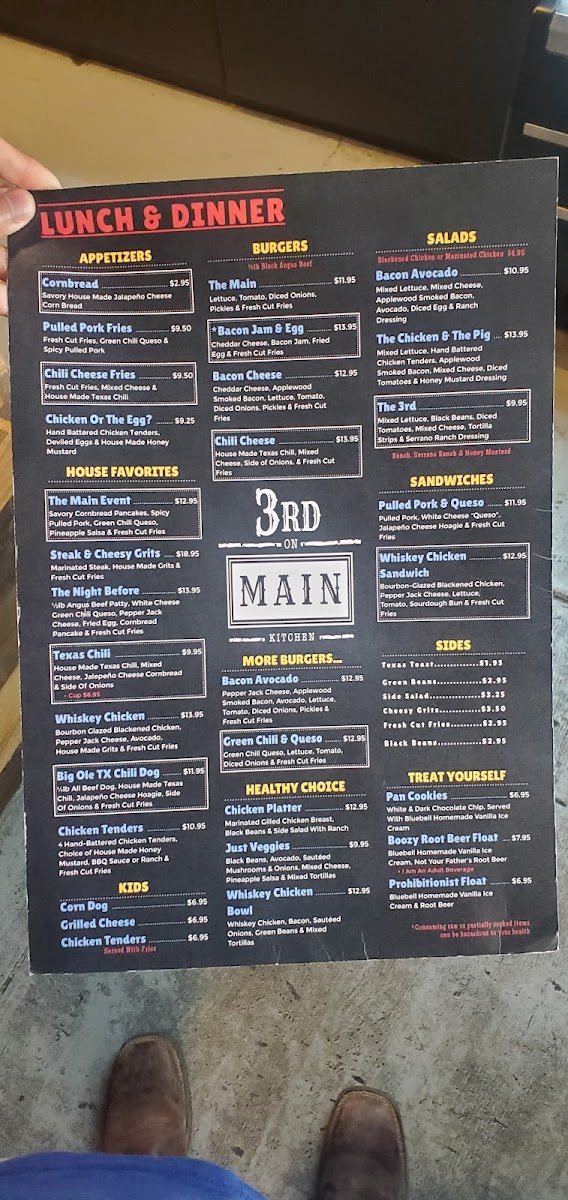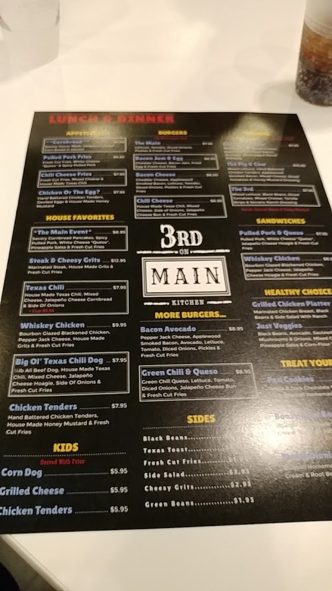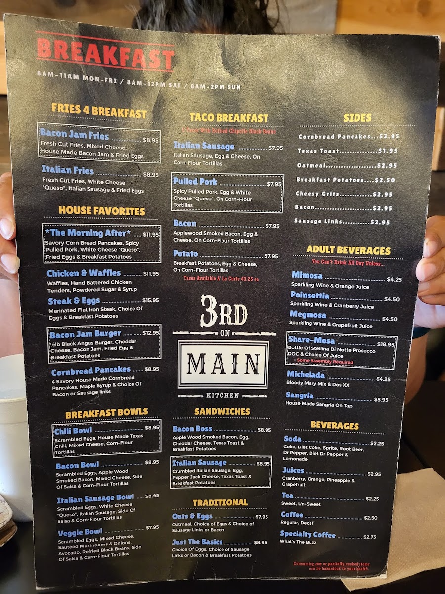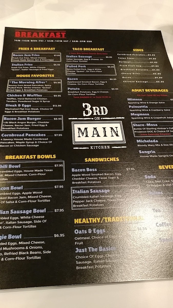 Welcome to 3rd On Main, a gem nestled in the heart of Bryan, Texas. This charming eatery is dedicated to serving up a delightful menu that captures the essence of comfort food. At the forefront is their inventive Fries 4 Breakfast, featuring options like the irresistible Bacon Jam Fries topped with a fried egg and house-made bacon jam. For taco enthusiasts, the Taco Breakfast menu offers delectable choices such as spicy pulled pork and savory bacon, all wrapped in freshly made corn flour tortillas.